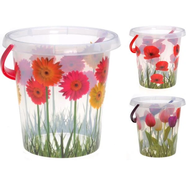 Het set bestaat uit een emmer met klaprozen, een emmer met tulpen en een emmer met gerbera’s. Ze hebben allen een inhoud van ca. 12 liter.