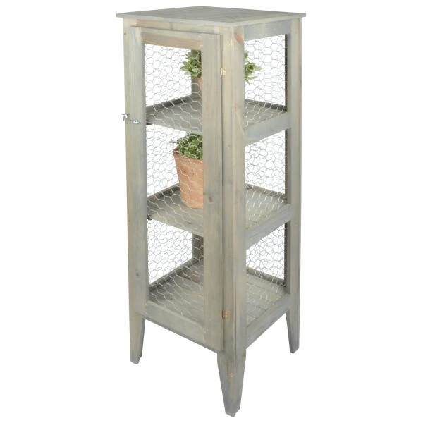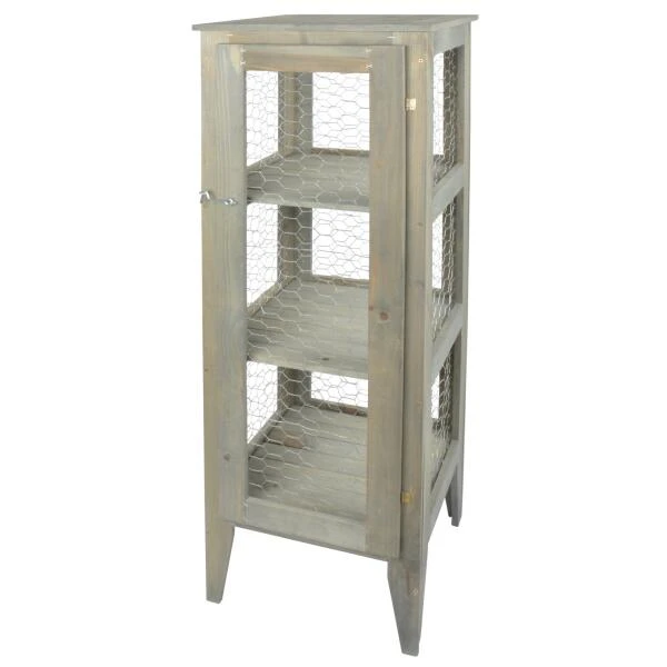Een mooie étalagekast met een landelijke look geschikt om planten te etaleren. Het kippengaas beschermd zaailingen tegen vogels.