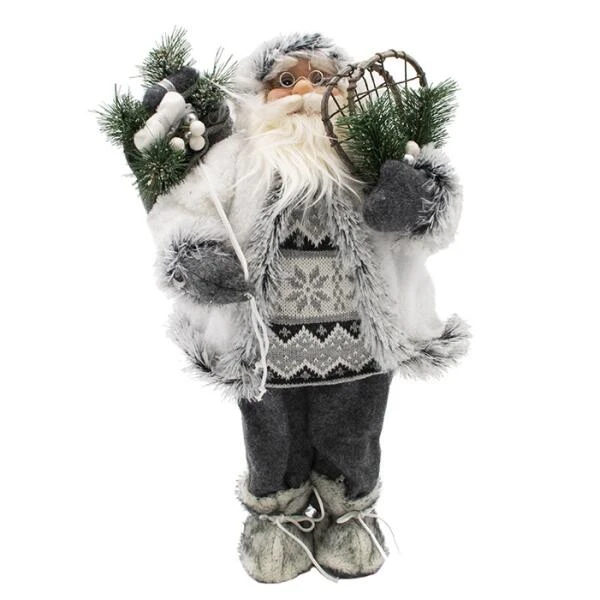 Een prachtige kerstman met een mooie outfit, sneeuwraketten in de ene hand en een zak vol geschenken in de andere hand. Onmisbaar als kerstdecoratie.