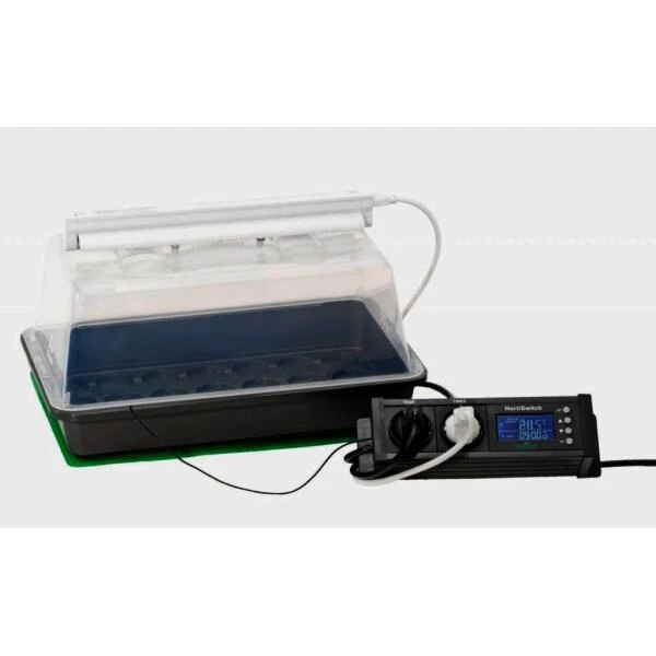 Kweekkas met verlichtingseenheid, warmtegeleiding door middel van de geoptimaliseerde bodem van de onderbak en uniforme waterverdeling door goten in de schaal.