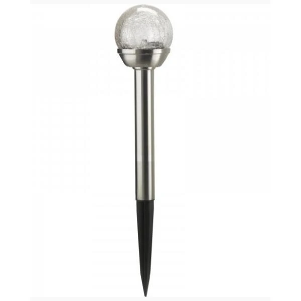 Tuinverlichting hoeft niet saai te zijn. Dat bewijst deze opmerkelijke verlichtingspaal. Een mooie glazen lichtbol in gekrakeleerd glas die rust op een metalen grondpin.