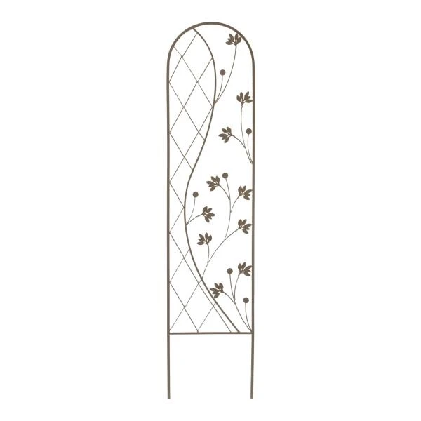 Decoratief metalen hekje met plantenmotief. Kan gebruikt worden als versiering in bloemenborders of als steun voor het omhoog begeleiden van klimplanten. Plaats het hek met beide pinnen stevig in de grond of bevestig het aan een muur.