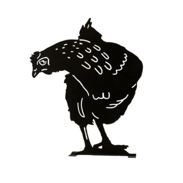 Je kan het silhouet van de kip ergens in de tuin vastschroeven dankzij de voorziene gaten of je kan het gewoon ergens neerzetten dankzij de bijgeleverde zwarte metalen voetclips.