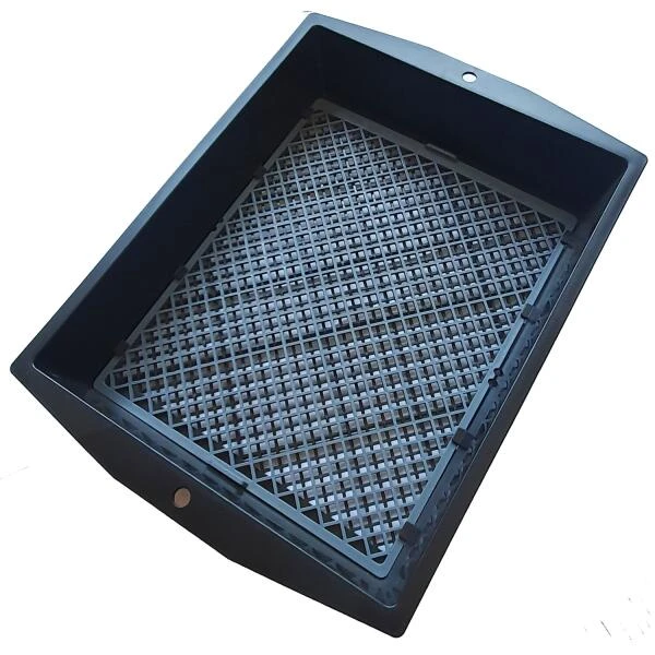 Dit raster kan je zeer eenvoudig en snel verwisselen. Het net en de groene, stevige zeef is van gerecycleerd polypropyleen.