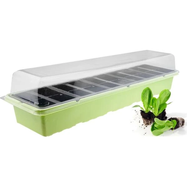 Kweekkasje met transparant deksel om in te zaaien of te stekken. Door de handige afmetingen ideaal om te gebruiken op de vensterbank of in een tuinkas.
